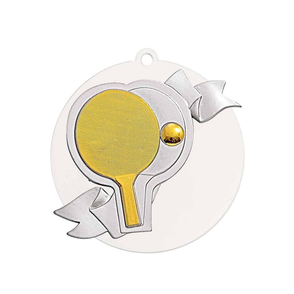 Cette médaille de tennis de table associe élégamment un fond en acrylique à une applique en métal finement sculptée. Le design met en avant une raquette jaune accompagnée d’une balle assortie, toutes deux mises en valeur sur un fond argenté orné de rubans stylisés. Ce visuel dynamique évoque la vivacité et la précision propres au tennis de table. Le contraste entre les matériaux et les couleurs confère à cette médaille une allure moderne et sportive. Parfaite pour récompenser les réflexes, la concentration et la maîtrise technique, elle incarne les valeurs fondamentales du tennis de table.